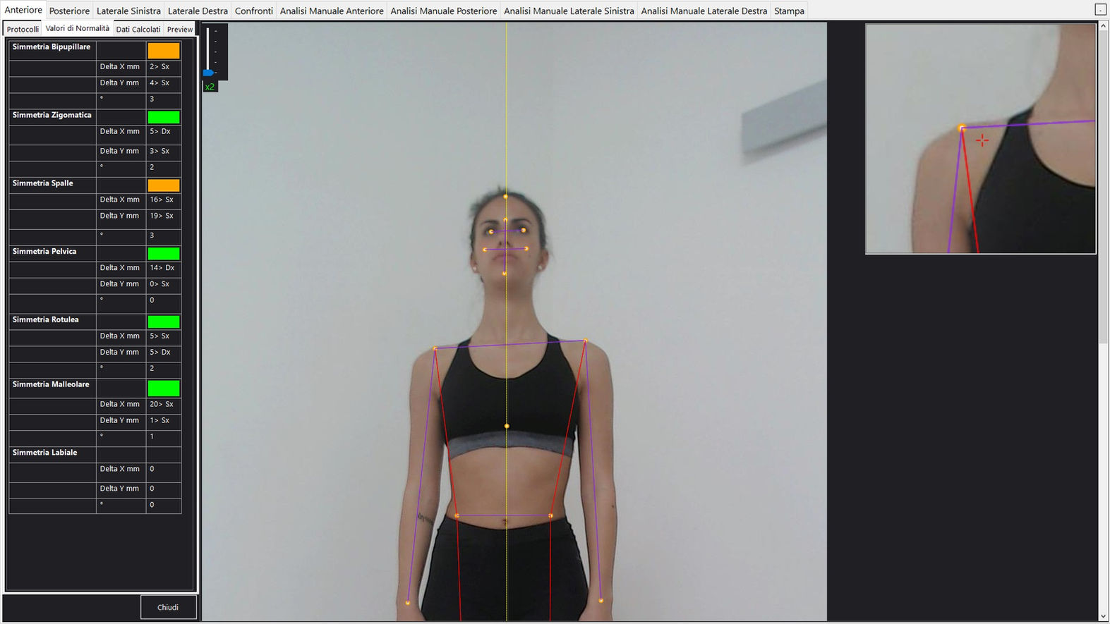 Il sistema permette di effettuare l’analisi morfologica del corpo per valutare visivamente e quantificare numericamente le eventuali asimmetrie di un paziente.